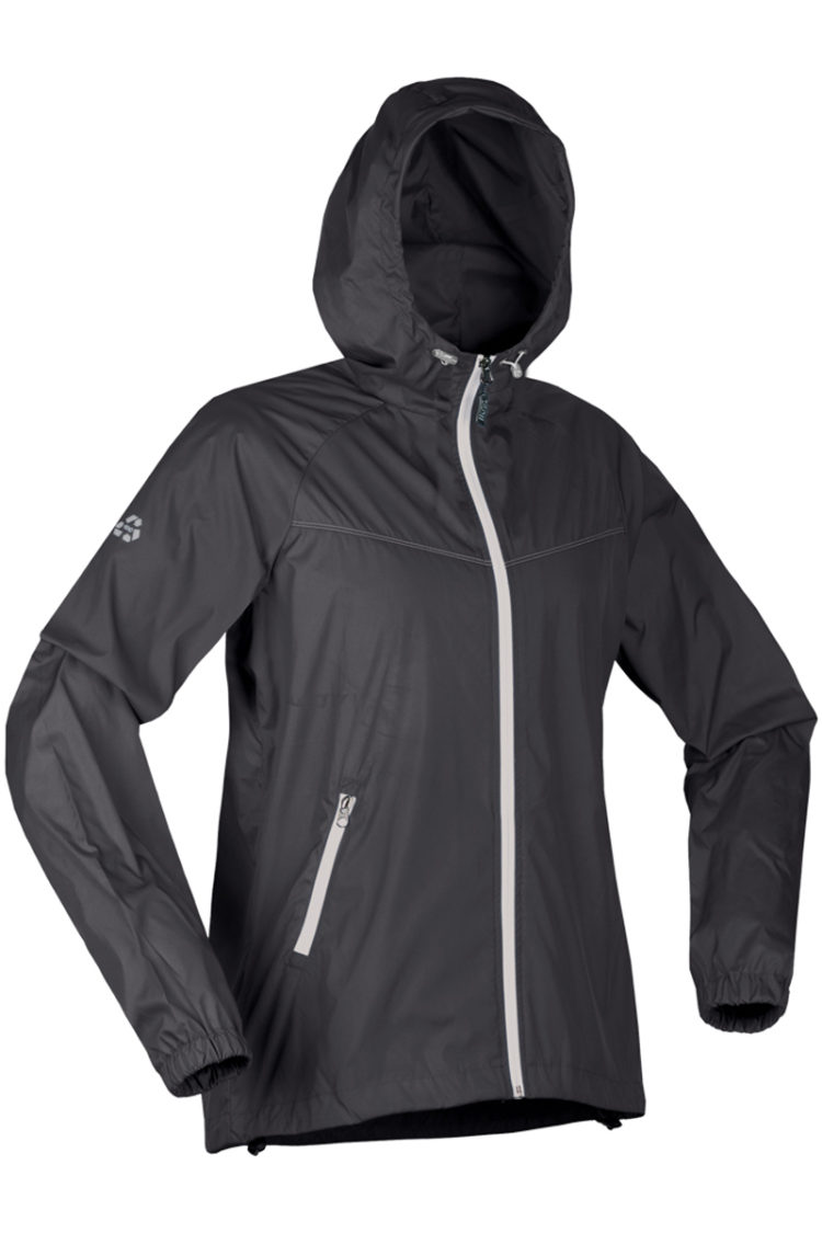 A lightweight, raglan-sleeve jacket with a diagonal contrast double-needle stitching accent across the lower chest and around the shoulder, and matching contrast zippers (x3). Features an elastic cuff and hood toggle-adjusts.